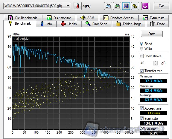 A titolo di confronto ecco il tracciato di HD Tune dell'HDD connesso direttamente al controller SATA.