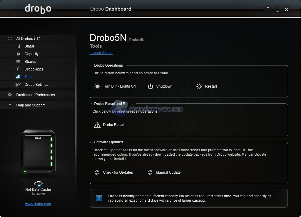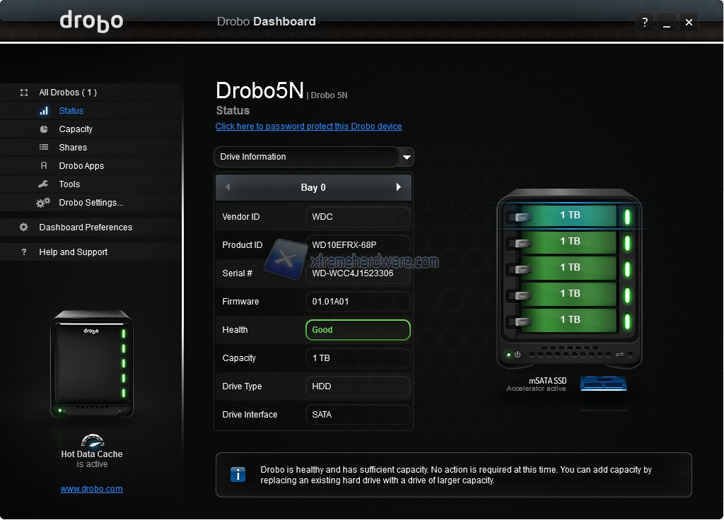 Nella sezione “Status” possiamo verificare la salute del nostro volume e dei dischi installati all’interno del Drobo 5N.