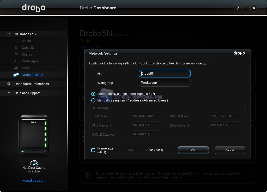 Se vogliamo modificare l’indirizzo IP del Drobo 5N o il nome del sistema stesso allora rechiamoci nella schermata “Network Settings”.