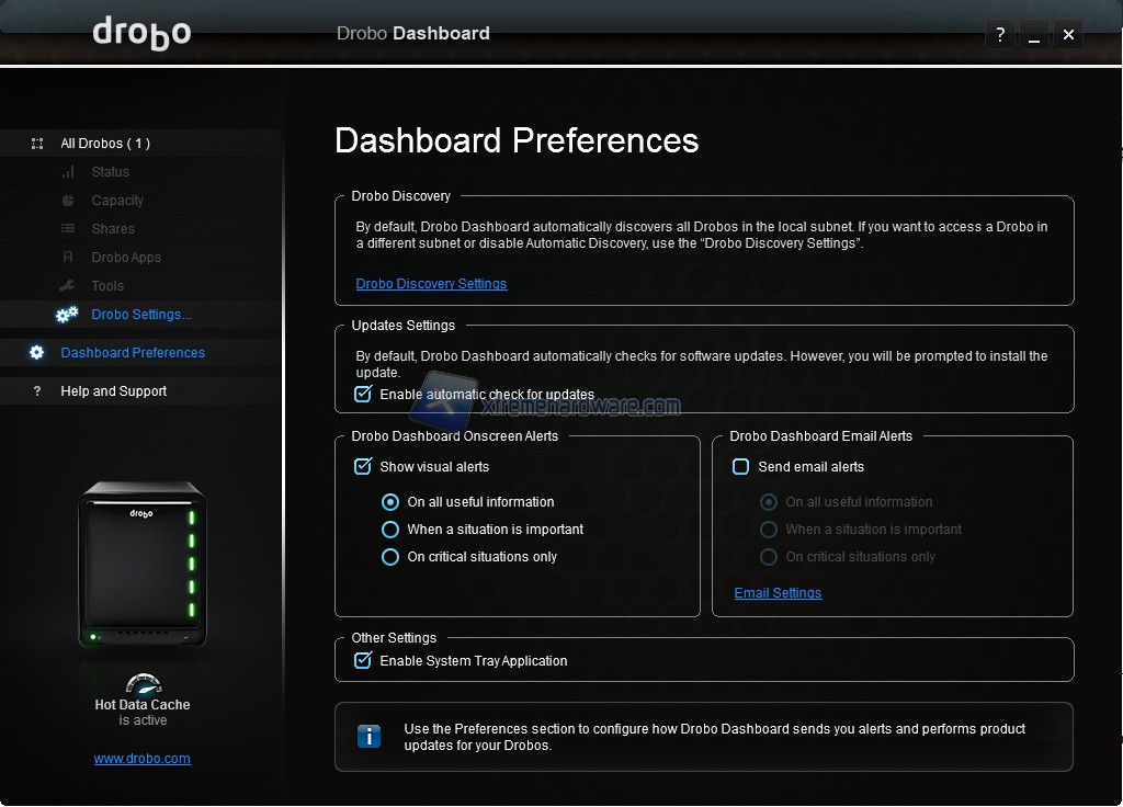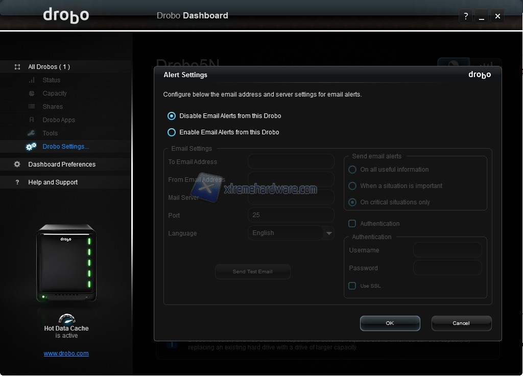 Come per i migliori prodotti anche il Drobo 5N ha un sistema di notifiche di malfunzionamenti o “situazioni critiche” via mail; trovate il tutto in “Alert Settings”.